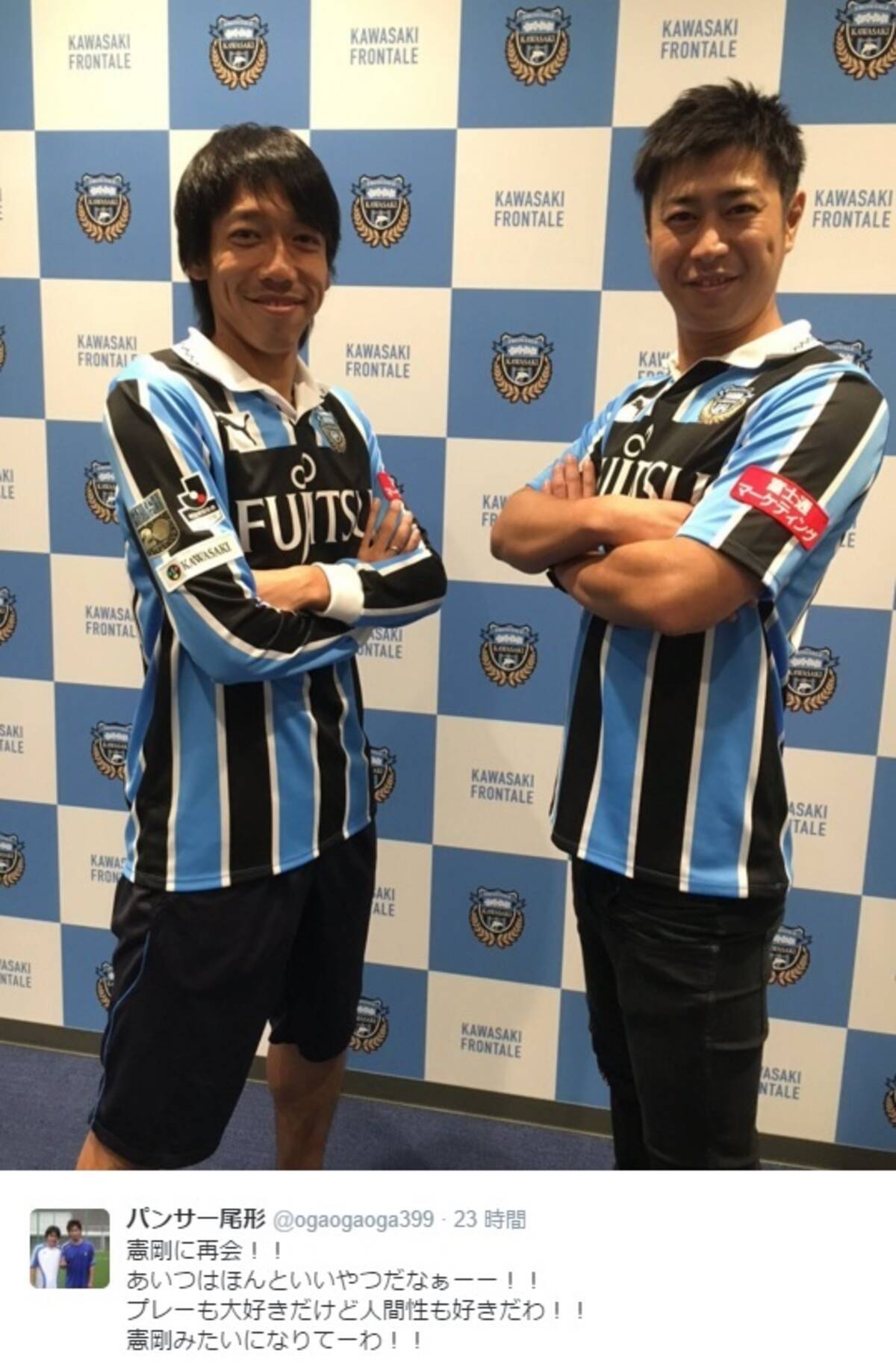 中村憲剛 V Twitter 練習後 中央大学サッカー部の先輩でもあるパンサー尾形さんが麻生に来てくれました 今年のホーム開幕戦の始球式を務めていただきます 尾形さん よろしくお願いします 一緒の舞台で仕事できる日が来るなんて 不思議な感じだ 笑 T